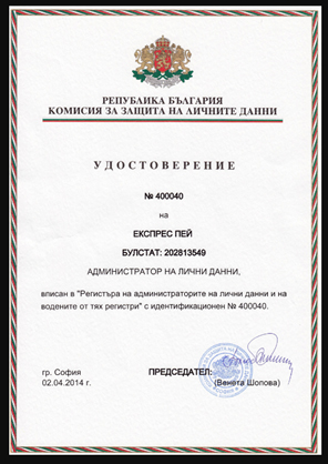 - Експрес Пей ЕООД е предприело всички необходими мерки срещу изпиране на пари, в съответствие с изискванията на Държавна агенция „Национална сигурност“ (ДАНС).